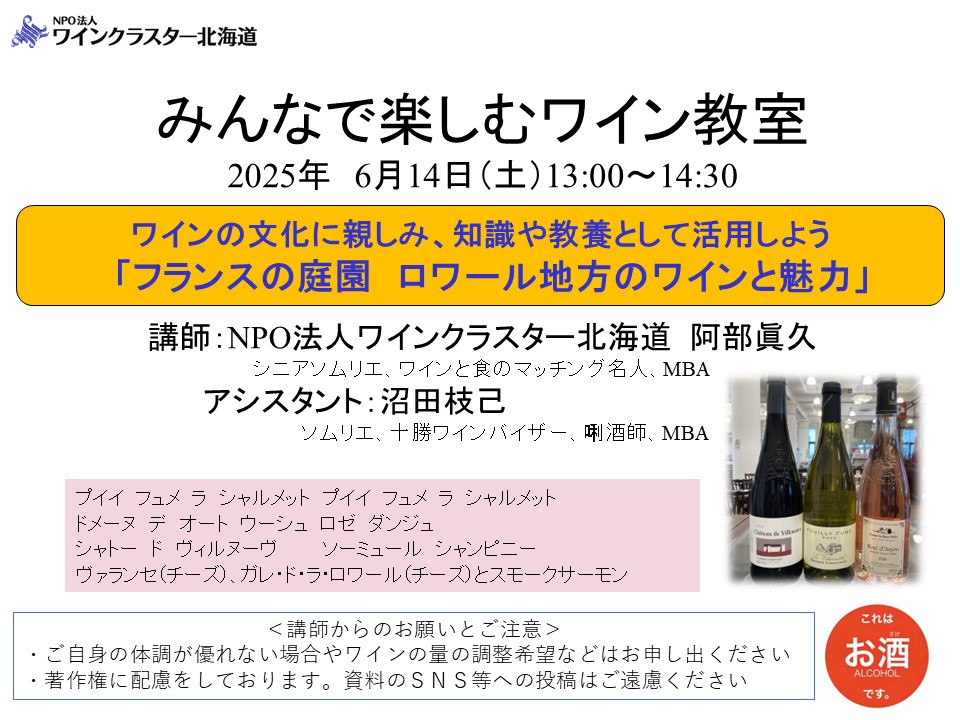 みんなで楽しむワイン教室 2025年6月 2025年6月14日(土)13:00~14:30 道新文化センター小樽「みんなで楽しむワイン教室」を開催しました 昨年度のテーマ「歴史と地理が織りなす世界のワイン産地のストーリー」(インプット型)から、 本年度はテーマは「ワインの文化に親しみ、知識や教養として活用しよう」(アウトプット型)に変わり講義時間の延長、教室レイアウトの変更を行いました。 2013年4月に開講した本講座は「13年目」に入りました。感謝の気持ちでいっぱいです! 2025年6月14日 阿部 眞久