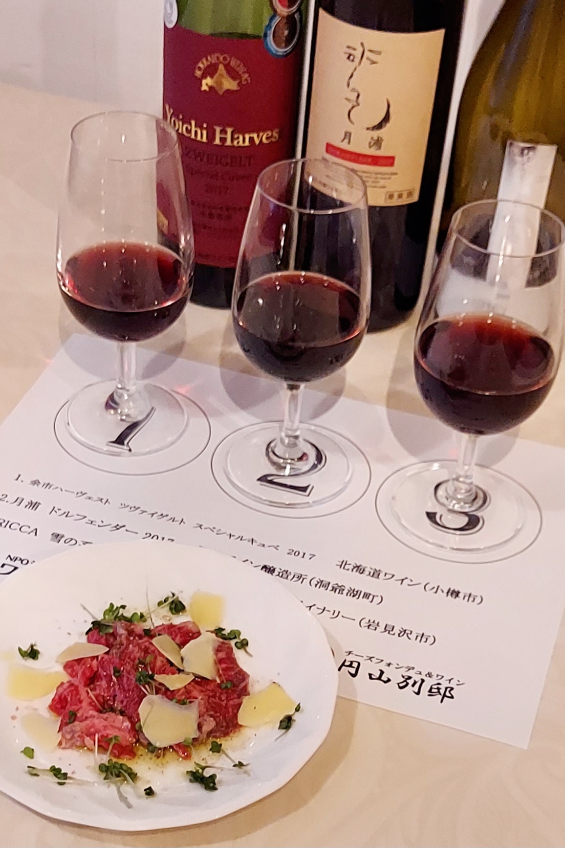 教材:余市ハーベスト ツヴァイゲルト2017、月浦ワイナリー ドルンフェルダー2017、宝水ワイナリー レンベルガー2015