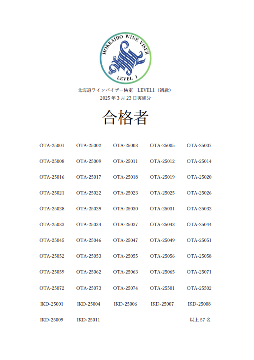 2025年3月23日(日)実施「北海道ワインバイザー検定 LEVEL1(初級)」の合格者(受験番号)は以下の通りです。